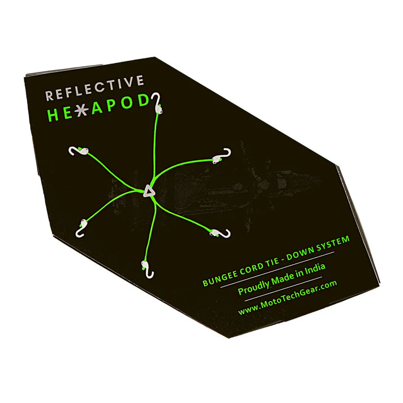 Building up on the success of the Hexapod, MotoTech now brings to you this new Reflective Heavy Duty Hexapod bungee cord, a multipurpose bungee tie down system, which gives you ample options and ways to fasten luggage or cargo loads using 3 or more of the bungee arms.
