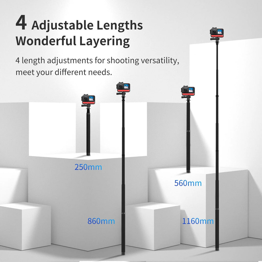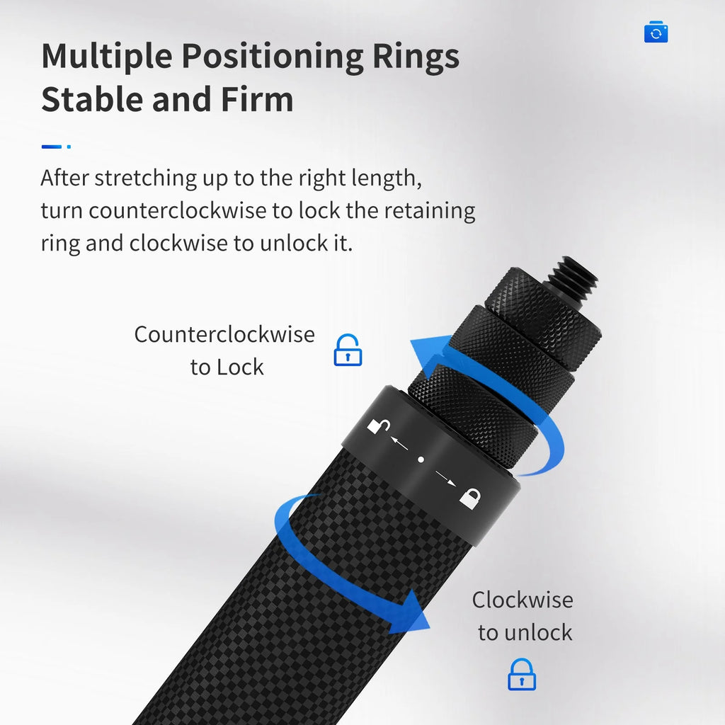 This professional-grade TELESIN carbon fiber monopod delivers exceptional stability and lightweight performance for action camera enthusiasts. Constructed from premium carbon fiber, it offers superior strength-to-weight ratio while resisting corrosion and impact damage—ideal for diving and challenging environments. The telescoping design extends to 1.16 meters, the optimal reach for panoramic and wide-angle cinematography. Four preset length positions (25cm, 56cm, 86cm, 116cm) provide shooting flexibility without constant adjustment. Precision positioning rings with intuitive twist-lock mechanism ensure rock-solid stability once extended. Universal 1/4" screw connections at both ends accommodate most action cameras, GoPro, DJI, Insta360, and standard tripod systems. A versatile tool for content creators demanding reliability and adaptability across diverse shooting scenarios.